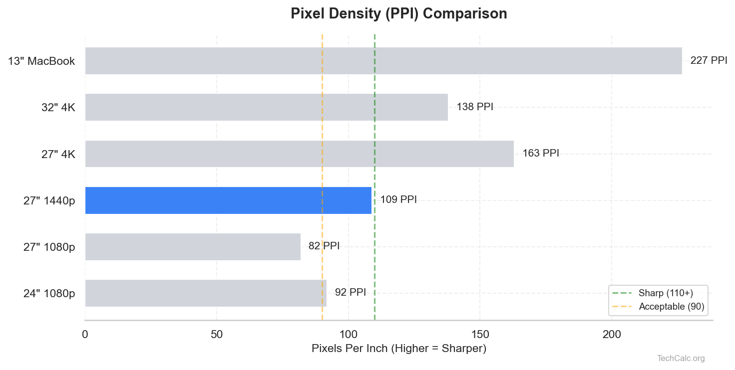 - 80-100 PPI: This range is common for larger monitors (e.g., 27-inch 1080p or 32-inch 1440p). At typical desk viewing distances, individual pixels might be discernible, but it's generally considered acceptable for most tasks, especially if budget or GPU performance is a concern.